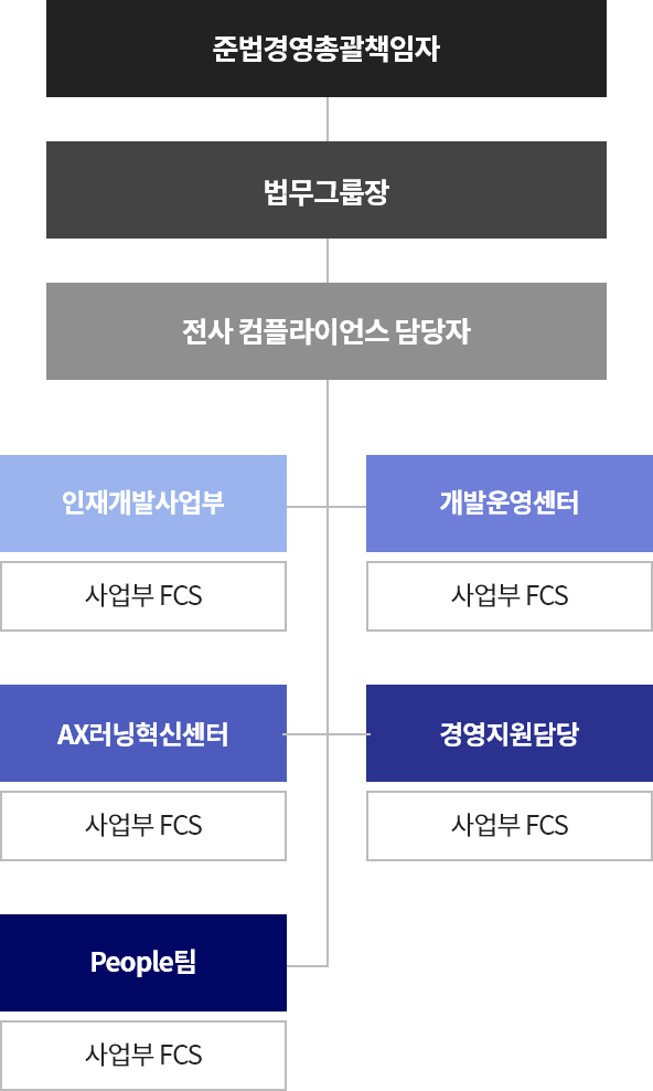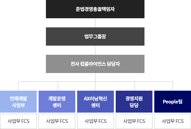 멀티캠퍼스는 준법경영 실천을 위해 경영지원실장을 준법경영총괄책임자로 선임하고 있으며 법무그룹내 컴플라이언스 전담자를 배치하여 CP프로그램 기획 및 운영/교육/점검 등 다양한 활동을 추진하고 있습니다. 또한 현장 중심의 자율적인 준법 문화 정착 및 확산을 위해 각 사업부별 현장 컴플라이언스 담당자 FCS(Field Compliance Specialist) 를 육성하여, 준법경영 정착을 위해 노력하고 있습니다.