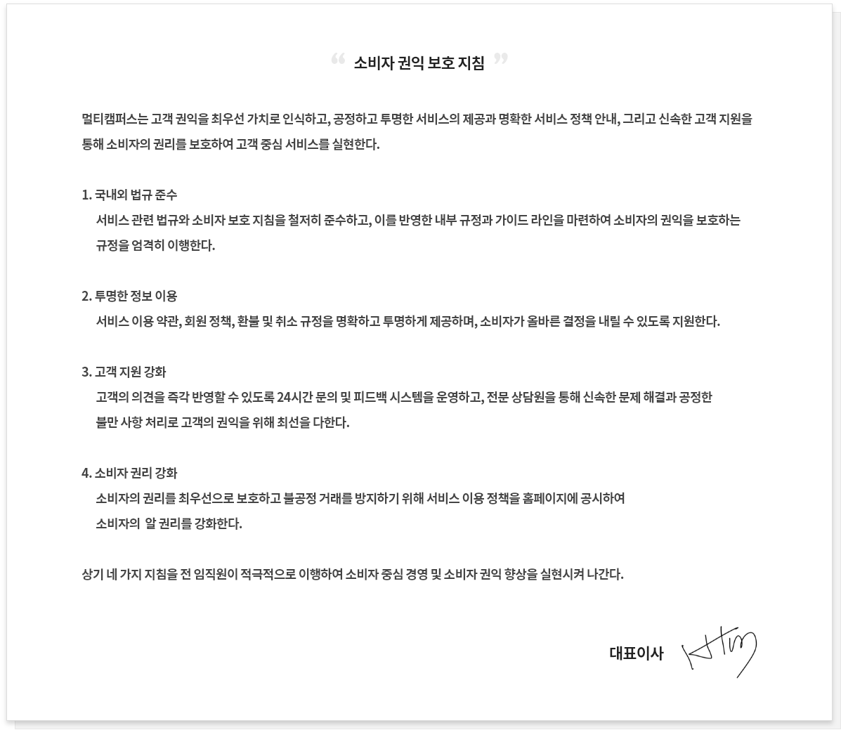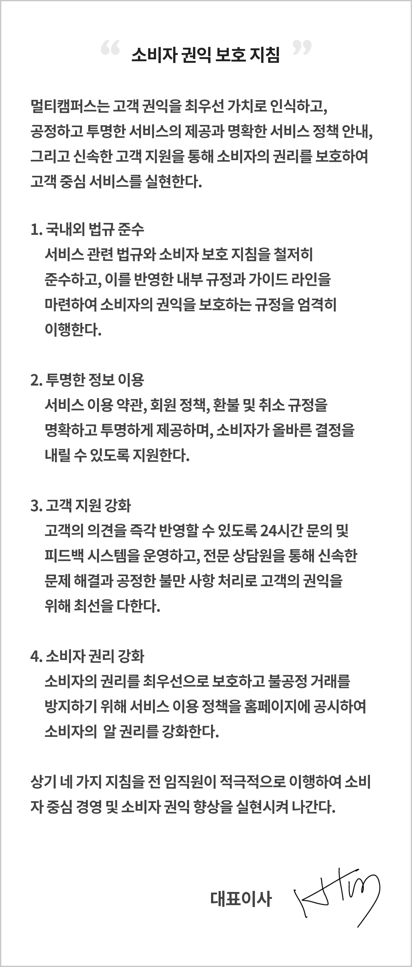 멀티캠퍼스는 고객 권익을 최우선 가치로 인식하고, 공정하고 투명한 서비스의 제공과 명확한 서비스 정책 안내, 그리고 신속한 고객 지원을 통해 소비자의 권리를 보호하여 고객 중심 서비스를 실현하고자 합니다.