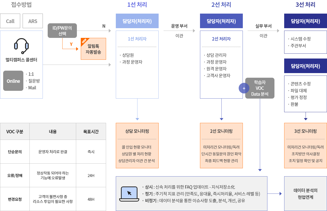 멀티캠퍼스는 고객의 불편 및 제안사항을 포함한 VOC를 다양한 채널을 통해 청취하고, VOC 관리 시스템과 프로세스를 통해 이를 철저히 관리하고 있습니다.