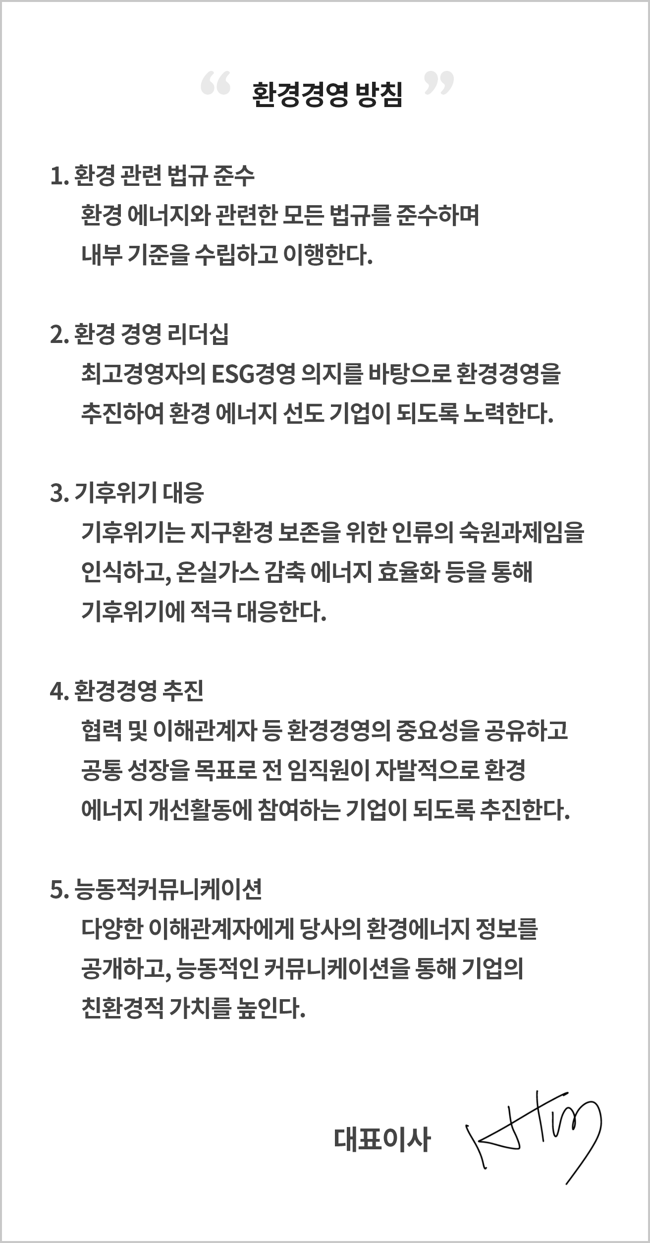 온실가스 및 에너지 소비 관리를 기반으로 장기적인 환경경영 전략을 수립하며 사업장 내 에너지 사용 효율을 높이고, 지속적인 성과 관리를 통해 환경친화적인 경영을 최우선 가치로 인식하여 사회적, 윤리적인 책임을 다하는 기업이 되겠습니다.