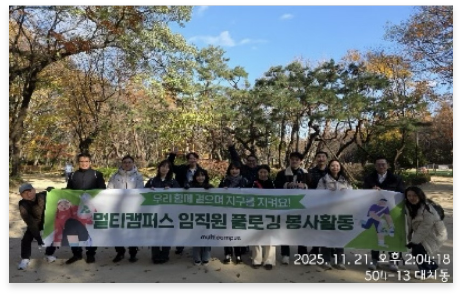 멀티캠퍼스는 기후변화와 환경보호에 대한 기업의 책임에 대해 명확히 인식하고 있으며 모든 임직원이 환경보호 활동을 직접 체험하고 실천할 수 있도록 2025년 부터 본사 사업장 인근의 강남구자원봉사센터 프로그램과 연계하여 다양한 환경보호 활동을 이행 중에 있습니다. 2025년에는 임직원의 자발적 참여를 바탕으로 폐 플라스틱 병뚜껑을 활용한 제로웨이스트 활동 2회, 폐 양말목으로 키링 만들기 활동 1회, 도곡동 인근 쓰레기 수거 플로깅 로드 활동 3회, 양재천 생태 보존을 위한 플로깅 활동을 1회 실시하였습니다.