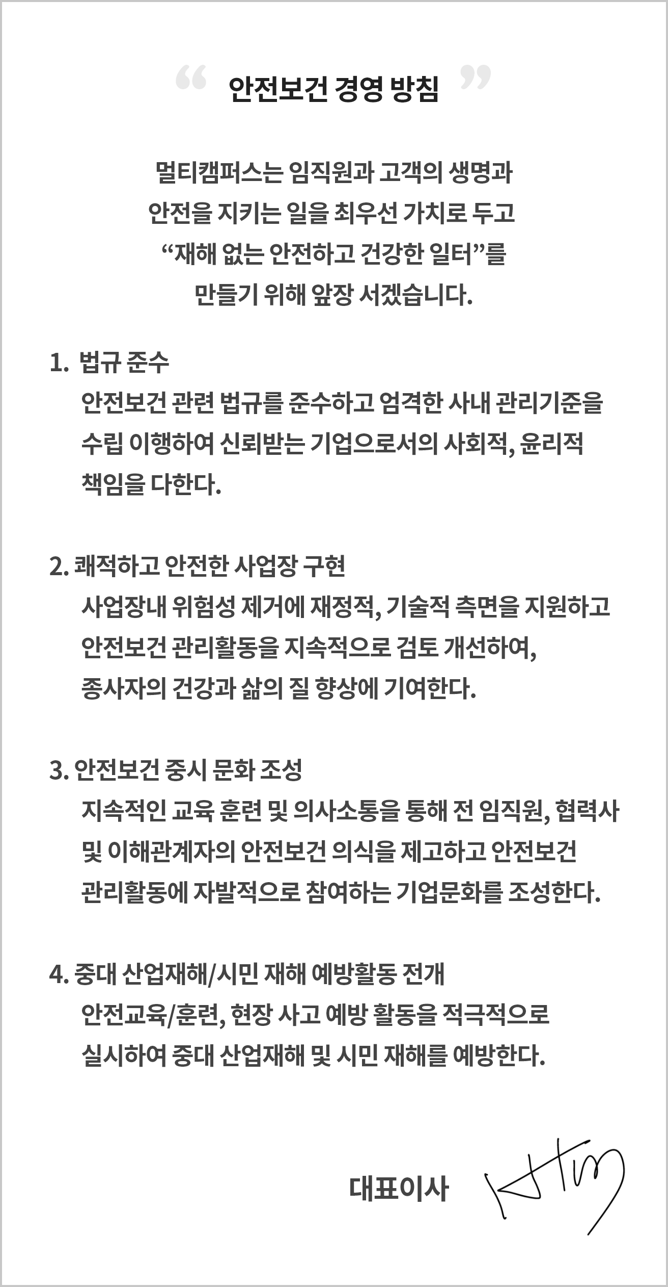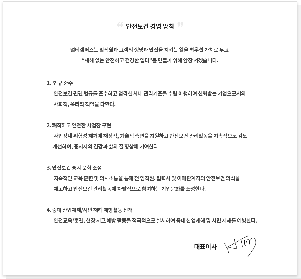 멀티캠퍼스는 임직원과 고객의 생명과 안전을 지키는 일을 최우선 가치로 두고 “재해 없는 안전하고 건강한 일터”를 만들기 위해 앞장 서겠습니다.