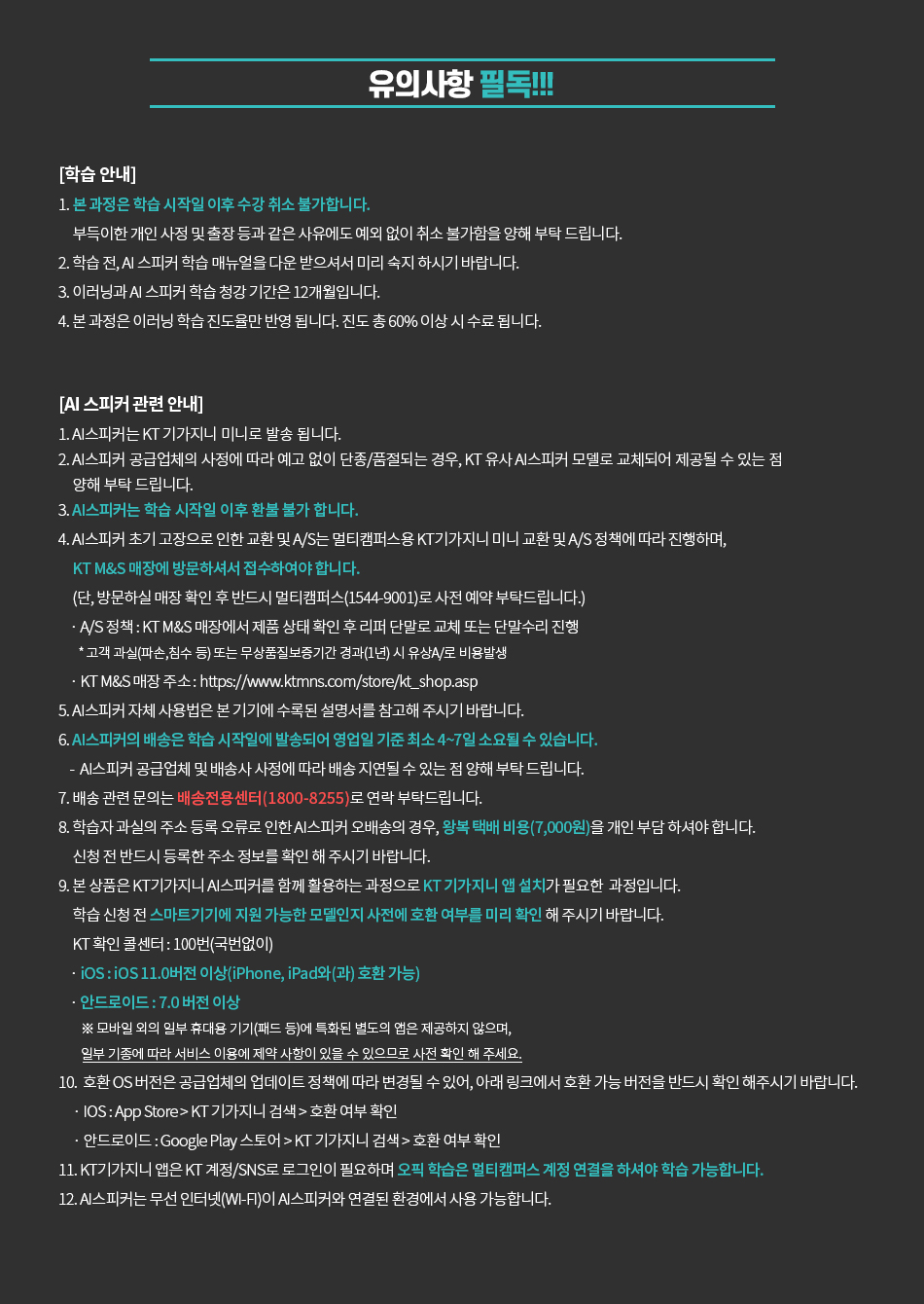 - 교재 수령 후 수강 취소 시 교재 회수가 진행되며, 미회수 시 개인 부담금이 발생할 수 있습니다.